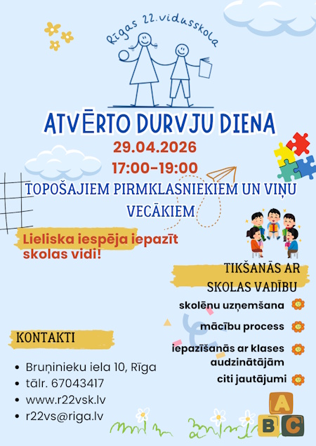 Riga LV LogoRīgas 22. vidusskola ir Rīgas valstspilsētas pašvaldības Izglītības, kultūras un sporta departamenta padotības iestāde.